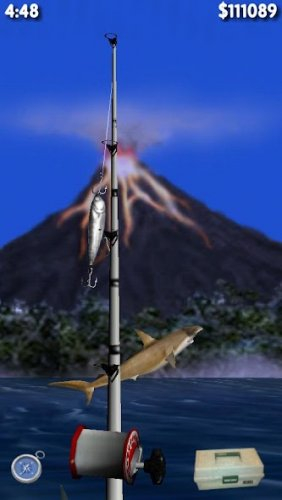 Махните своим устройством, чтобы забросить спиннинг. Как только приманка упадет, вам нужно подкрутить леску, для этого проведите пальцем по катушке. Теперь, когда приманка заброшена, нужно ждать, когда рыба клюнет. Сигнализировать поклевку будет крючок в верхнем углу дисплея и вибрация устройства. Подсекайте добычу с помощью встряхивания смартфона. Как только рыба устанет сопротивляться, шкала, что вверху экрана станет желтого цвета, тогда ее можно подтягивать катушкой.