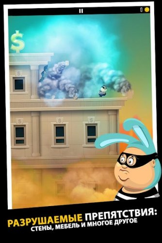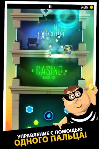 “Дэдди Вос э Тиф” отлично оптимизирована под планшеты и телефоны с HD экранами. Благодаря высокому качеству изображения хорошо подобранному музыкальному сопровождения, вы весело проведете время. Все что придется делать, это подбирать правильный момент, чтобы бандит прыгнул и проломил потолок. Делая жест пальцем по сенсорному экрану сверху вниз, ваш герой будет совершать скачок. Вам следует опасаться выпущенных ракет из преследуемого вертолета, полицейских и злых бабушек.