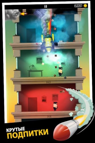 Подбирайте правильный момент и прыгайте полицейского на голову, тем самым нейтрализуя его. Кроме полицейских перед игроком появляться забавные предметы интерьера, такие как холодильники, сейфы и телевизоры. Прыгнув на холодильник герой моментально превратится в кубик льда, который будет быстро скользить и даже защищать от повреждений. А попав в ванную вы под ее весом моментально пробьете несколько этажей.