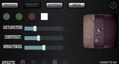 Кроме готовых фильтров, вы можете настроить цветопередачу сами, используя специальную вкладку, где можно регулировать цвета. Также если вам надоесть снимать обыкновенное винтажное видео, можете делать прекрасные старинные фотографии на 8 мм камеру, по боках которых будут затемнения. Все сохраненные снимки и видео сохраняются в папке sdcard/Vintage 8mm/. Хотя должны отображаться на вкладке media в приложении, но это недочет разработчиков.