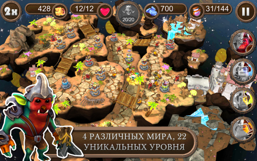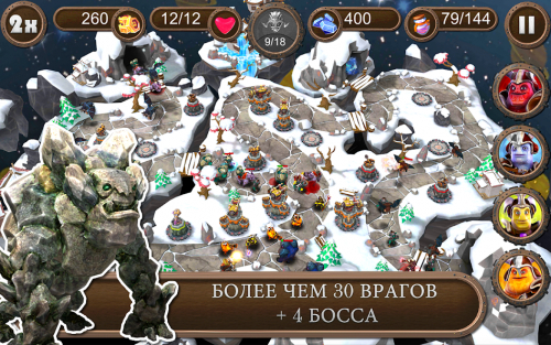 Спланируйте свою оборонительную тактику, размещая разные виды блокпостов в специально отведенных местах, чтобы они могли уничтожать захватчиков, количество которых увеличивается с каждым наступлением. В вашем расположении есть арбалеты, катапульты, пушки и громометы, а также специальные воины, которых можно перемещать по карте.