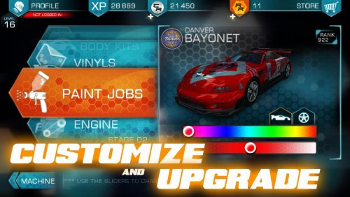 Перед началом карьеры предстоит пройти обучение, где вам покажут, как нужно управлять машиной. Например, вы сможете выбрать управление с помощью акселерометра и педалей газа и тормоза. Кроме того, у вас будет возможность приобретать новые болиды, а также производить апгрейд уже имеющихся. Так вы сможете улучшить мотор, подвеску, окрас и многое другое.