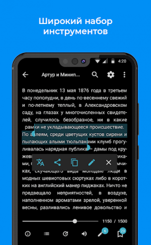 Интерфейс FullReader максимально прост, но несмотря на это, очень функционален. Вы быстро привыкните к управлению и разберетесь в основных возможностях. Например, можно выделить понравившуюся цитату и моментально отправить её в соц. сети.