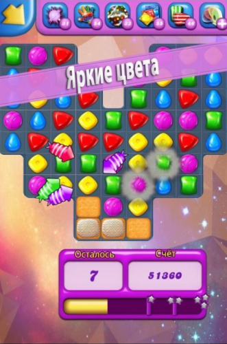 В качестве основных элементов используются многочисленные виды конфеток. Вам нужно найти одинаковые по типу и сложить их в цепочку, чтобы получить бонус. Разные режимы, сладкие бонусы, совместное прохождение с друзьями, прекрасный способ развлечься и скоротать время.