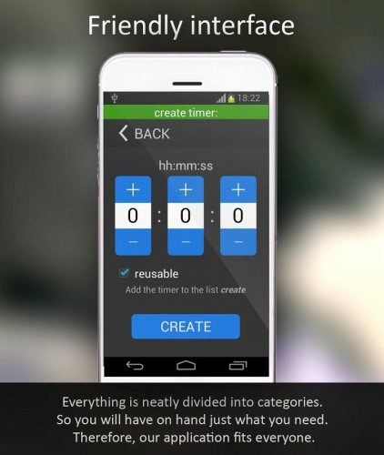 Над данным таймером трудилась студия Dream Art. Они постарались создать продуманный интерфейс и отличную функциональность. Хочется отметить, что основные функции были разделены на специальные категории.