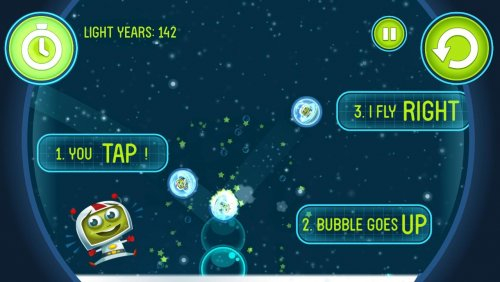 Представьте такую ситуацию, что космический звездолет терпит крушение на планете ХабблБаббл, где на дороге раскидано много пузырьков. Помогите НЛО пролететь как можно дальше, подбивайте ее с помощью этих пузырей.