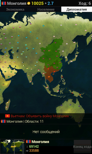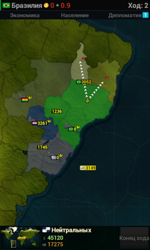 В начале игры, вы можете просмотреть всю карту и найти другие цивилизации, узнать их численность и состояние экономики. Территории, которые не отмечены цветом, можно заселить, пока они свободны.