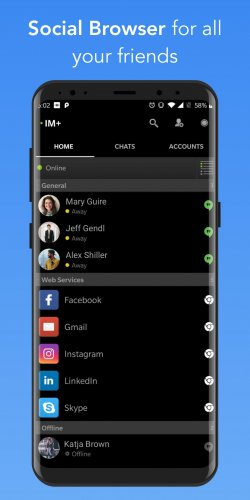 Отличное приложение, объединившие все популярные мессенджери, чтобы вы могли всегда оставаться на связи с своими друзьями. Вам не нужно устанавливать множество клиентов для определенного сервиса обмена мгновенными сообщениями. Достаточно установить IM+ Pro и вы всегда будете на связи в Facebook, Skype, ICQ, ВКонтакте, Mail.Ru Агент, Одноклассники.Ru, Я.Онлайн (Яндекс.Чат), MSN/Live Messenger, Google Talk, Yahoo!, AIM/iChat, MySpace и Jabber.
