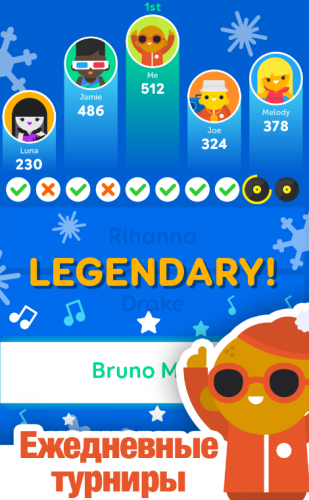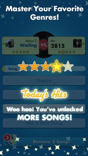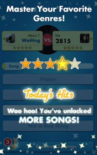 В викторине нужно за определенное количество нот, угадать песню и вовремя нажать на кнопку. Играть можно с реальным пользователями по сети, поэтому без эмоций просто не обойтись. Открывайте новые жанры и копите максимум очков.