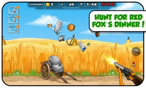 Непростое задание придумала жена старому Лису и вместо того, чтобы ремонтировать своего робота, он должен взять в руки ружье и пойти стрелять в уток. Не рискуя спорить с женой, он берет список и отправляется на охоту. Помогите бедному Лису стрелять в уток, которые будут летать над фермой.