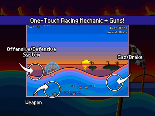 Гоночная аркада, сделанная в классическом стиле пиксельной графики, такой как вы видели в играх на приставках. Примите участие в спортивном соревновании на боевых катерах с пушками, где вам нужно правильно скользить по волнам и стрелять по соперникам из пулемета.