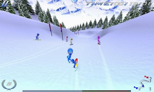Примите участие в гонке — кто быстрей спустится с горы и наберет больше очков по дороге. Не дайте соперникам обогнать вас, катайтесь на сноуборде и объезжайте специальные метки, деревья, чтобы получить дополнительный бонус. Подпрыгивайте на трамплинах и делайте трюки в воздухе, но не забывайте приземлиться на ноги, чтобы заработать очки за трюки.