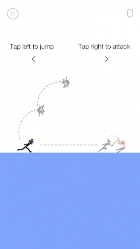 Здесь вам нужно как можно больше уничтожить красных ниндзя. На вашем пути будут не только вражеские, но и будут с вашего клана, их вам нужно перепрыгивать. Управление осуществляется с помощью нажатий на левую и правую часть экранов. Нажимайте на левую часть, чтобы прыгать или совершить двойной прыжок. Нажатия на правую часть экрана активизируют меч, которым герой нанесет удар по противнику.