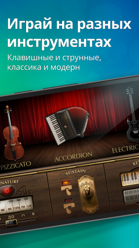 Играйте на инструменте в любом месте, просто достаньте свой телефон и тренируйтесь, радуя музыкой всех окружающих. Эта программа для тех, кто изучает или уже умеет играть на пианино. Она станет отличным помощником в изучении музыки, нот и аккордов, или создания своей собственной музыки в свободное время. Приложение имеет несколько клавишных музыкальных инструментов - достаточно зайти в меню настроек и выбрать один из 8 возможных. Там вы найдете пианино, большое пианино, орган, аккордеон, арфу, клавесин и гитару.
