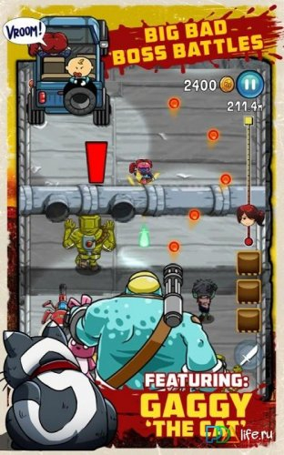 Убегайте от них и одновременно прицельно стреляйте, чтобы пробежать заданное уровнем расстояние. Вам нужно наклонять свое устройство в правую и левую сторону, чтобы девочка бегала по дороге в разные стороны, а брат, который сидит в кенгурёнке, будет беспрерывно стрелять из пистолета и использовать меч.