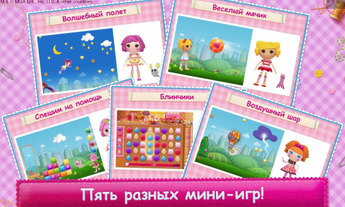 Отличная игра для девочек, которые уже познакомились с мультфильмами, а возможно уже имеют куклу Lalaloopsy. Большая страна развлечения ждет вас и подготовила много развлечений в виде мини-игр. Вам придется спасать котика, летать на воздушном шаре, помогать на кухне с ингредиентами, а также крутиться на карусели.