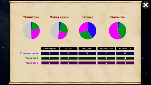 Игра, позволяет создать свою веру и начать ее развивать путем создания храмов и жрецов на доступных клетках. Создайте свою и улучшайте философию, чтобы появлялось больше паломников и круги ее влияние быстрей увеличивались.