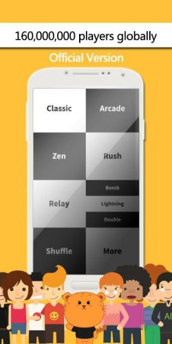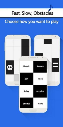 Игра имеет несколько интересных игровых режимов. Например, в простом классическом режиме просто будете нажимать на кнопки, а вот уже в аркадном режиме нужно на бегучей ленте, успеть нажать не черные клавиши. Также есть такой интересный режим как Дзен, где вы испытаете свою скорость нажатия на время.