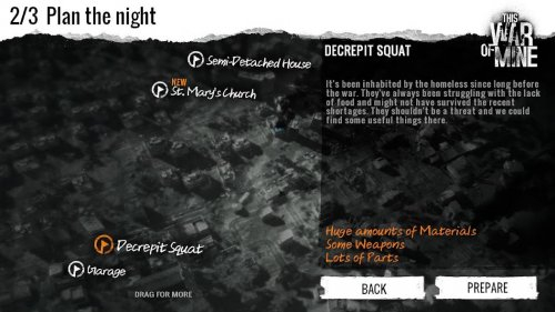 Война затянулась на многие года, и город в которой находятся ваши главные герои уже давно находиться под блокадой правительственных войск. Выжить в городе очень тяжело, днем вы не увидите ни одного живого человека. Ночью люди начинают выходить из своих убежищ на поиски продуктов и разных запчастей. Они могут понадобиться для построения укрытий или инструментов.