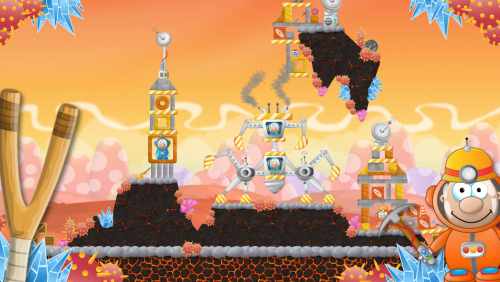 Ваше задание выбрать правильный угол наклона, а также силу натяжки, чтобы монстр полетел и попал в астронавтов. Используйте их свойства, так как некоторые будут иметь особые дополнительные функции, такие как взрыв после нажатие или подлет выше при нажатии на экран.