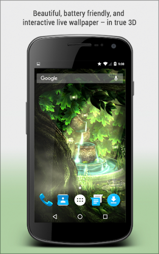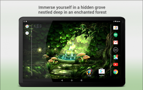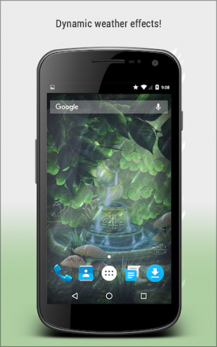 В центре экрана расположен фонтан, из которого течет вода, и вокруг которого растут прекрасные цветы, а с неба падают солнечные лучи. Вся эта красота находится на фоне красивого зеленого леса с широкими листьями. Иногда погода меняется, и на смену лучикам приходит гром и молния, экран сереет и начинает идти дождь. Что может быть изящнее анимированных изображений с лесом и водой, которые будут успокаивать вас.