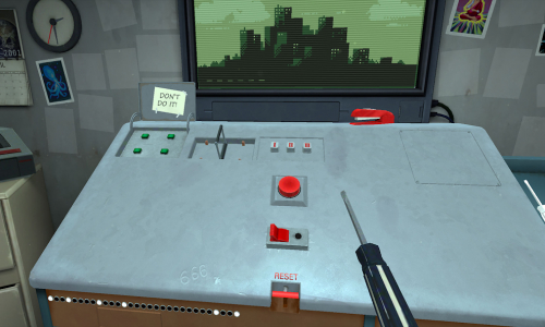 Please Don't Touch Anything 3D — это головоломка, в которой нужно найти способы нажатия на красную кнопку, которая активирует ядерную боеголовку.