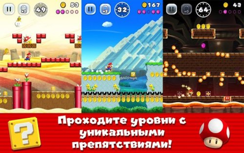 В Super Mario Run главный персонаж постоянно движется и перепрыгивает через небольшие препятствия. Ваша задача — обходить большие пропасти и подниматься высоко вверх, чтобы собирать монетки или переходить на другие платформы.