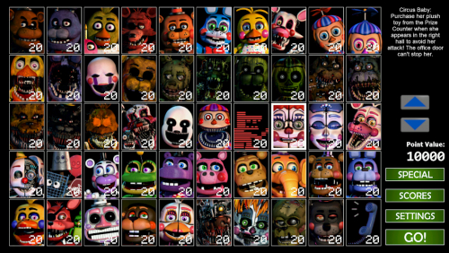 В этой части игры у вас будет шанс самому выбрать аниматроников, которых можно было увидеть в прошлых частях FNAF. Это будет полностью настраиваемая ночь, которая понравится всем фанатам игры "5 ночей с Фредди".