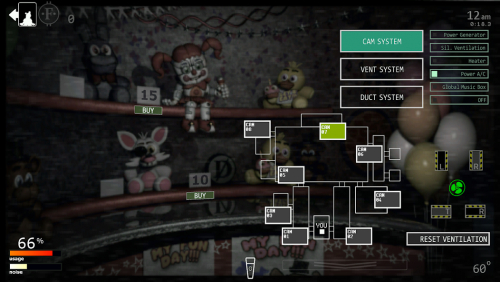 Для этого герой должен не закрывать глаза, а тщательно всё проверять — закрывать и открывать двери, контролировать вентиляцию, камеры наблюдения, включать и выключать кондиционер, регулировать температуру. Только таким способом он сможет спрятаться от аниматроников, которые будут его преследовать. FNAF 7 радует тем, что вы можете добавить своих любимых аниматроников и увеличить уровень сложности. Доступно 20 уровней сложности, что позволяет каждому любителю таких игр, найти свой непроходимый вызов.