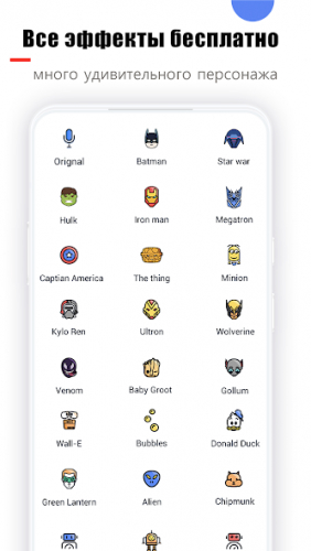 Перечень звуковых фильтров, которые будут доступны для наложение на ваш голос огромен, и самое главное - все они выполнены на самом высоком уровне. Записав своего звука, вы сможете изменить его до неузнаваемости и озвучить его легендарными персонажами кино и сериалов. Так к примеру, на выбор будут доступны голоса Дарта Вейдера, Бэтмена и даже мифических героев.