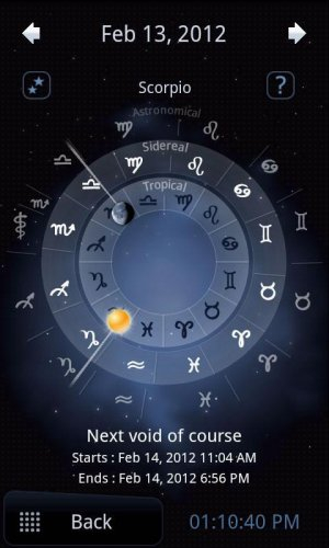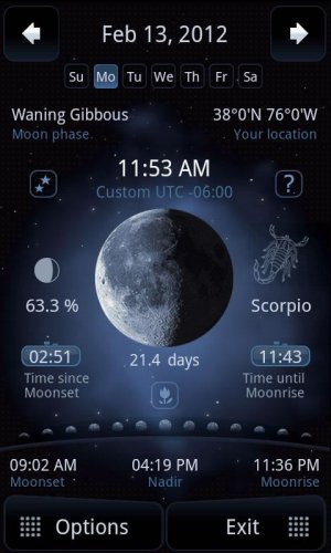 С помощью GPS приложение будет показывать состояния спутника Земли для вашего региона, вы также можете вручную указать свою страну или координаты своего местоположения. Имея всю общую информацию о спутнике, Deluxe Moon покажет вам точное время фаз, гороскоп, описание лунных дней, а также время восхода и захода Солнца.