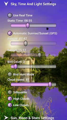 В настройках можно изменять интенсивность колебания волн, мерцания рыбы или других водоплавающих насекомых на воде, количество птиц, летающих в небе, приближать или отдалять от себя замок. В зависимости от времени на обоях будет кончатся день и наступать ночь.