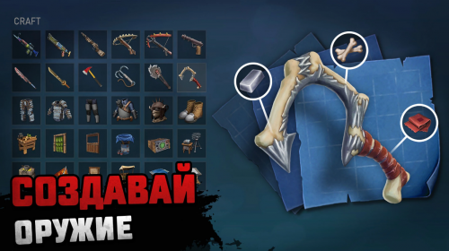 Голыми руками не удастся чего-либо добиться. Создавайте оружие, инструменты (молоты, топоры и многое другое). Для создания различных предметов в игре имеется более 100 различных вариантов. Используйте свой крючок, который поможет найти полезные предметы, плавающие в воде.
