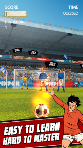 Станьте настоящий бомбардиром, забивайте голы из любых дистанций и любых позиций на футбольном поле. Касательным движением руки по экрану бейте мяч в ворота, а также старайтесь не попасть в вратаря и защитников.