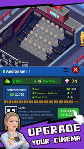 Idle Cinema Empire Tycoon - это симулятор для телефона, который содержит элементы экономической игры.