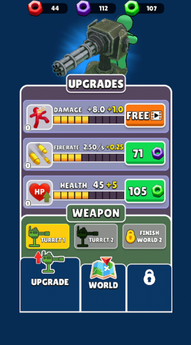В начале у вас будет только турель и пулемёт. Со временем, набираясь опыта вы получите возможность обзавестись другим, более мощным оружием и способностями. Среди последних особенно хочется выделить замедление времени и ядерный удар. При грамотном использовании они могут оказать очень серьёзную помощь. Значительным подспорьем в обороне являются специальные оборонительные башни. Их тоже следует улучшать и совершенствовать по мере игры.