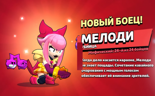 Melody – новый герой, обладающий как преимуществами, так и недостатками. Среди достоинств героя можно выделить среднюю дистанцию боя, которая никак не влияет на урон. Каждая наносимая атака, создает вокруг бойца ноты, максимальный стак которых составляет 3 штуки. Ноты наносят дополнительные атаки на ближнем расстоянии и со временем пропадают. Ультимативной способностью является подбежка, которую можно активировать 3 раза.