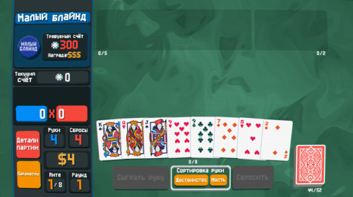 В ходе раунда вы сможете сбрасывать ненужные карты и добирать необходимое количество в надежде получить сильнейшую комбинацию. За выигранные партии игроку начисляются очки, которые меняются на виртуальные деньги. За данную валюту вы сможете купить новые колоды, различные умножители очков и иные бустеры в виде карточных Джокеров. С каждым новым этапом сложность игры возрастает, заставляя вас думать на шаг вперед и идти ва-банк.