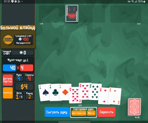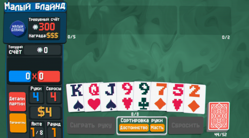 Главная геймплейная фишка состоит в том, что вы играете не против реальных пользователей, а против самой игры. На стол выкладывается 8 карт, из которых вам нужно выбрать наиболее сильную “руку”. И в данном случае желательно помнить основные виды комбинаций в Техасском Холдеме, но и без этого виртуальный оппонент будет давать вам различные подсказки на начальных этапах. В игре также присутствуют малые и большие блайнды, согласно которым устанавливается минимальный размер ставок на ход.