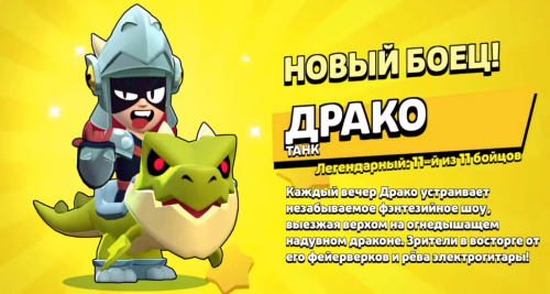 Draco – по-настоящему крутой персонаж, который пополнит список легендарных бойцов в 55.246. Фишкой героя является его оружие – электрогитара, которой он мастерски орудует на больших дистанциях. Запас здоровья – 11000 ед., что является одним из самых высоких среди всех персонажей. Одной из сильных сторон музыканта является его супер, во время которого он садится на дракона, тем самым повышая скорость передвижения по карте и нанося массовый урон огнем по всем, кто попадет в его радиус действия.