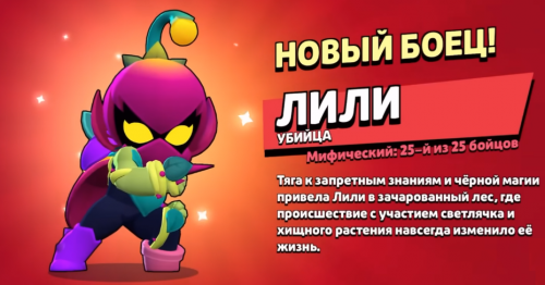 Lily – персонаж женского пола, из мифической лиги, сочетающий в себе синтез человека и растения. Боец невероятной силы, которая раскроется по максимуму на близкой дистанции. Главной фишкой Лили выступает ее неуловимость за счет суперталанта – телепортации. Во время боя она бросает снаряд в цель, и в случае попадания телепортируется прямо за его спину.