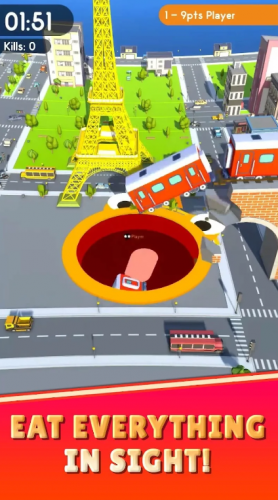 Исследуйте городские районы, такие как офисные здания, парки и дороги, и ищите цели, которые можно поглотить, чтобы расширить радиус червоточины. Конкурируйте с другими дырами, чьи габариты могут стать больше вашей и, соответственно, засосать уже вас. Каждое столкновение с более крупной дырой может стать фатальным, поэтому будьте внимательны и выберите наиболее эффективный маршрут для достижения своей цели.