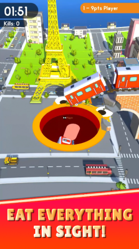 Ваша главная цель — стать самой большой чёрной дырой в городе. Для этого вам нужно засасывать различные объекты, начиная с мелких, таких как пешеходы и кусты, и заканчивая большими строениями. Но помните: чем больше ваша дыра, тем больше структур вы сможете поглотить. Вам предстоит правильно планировать свою траекторию от объекта к объекту, чтобы обогнать соперников и стать первым.