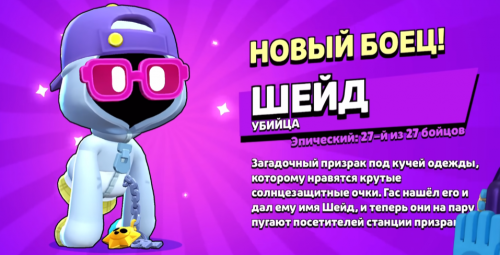 Шейд — эпический убийца, обнаруженный Гасом на Призрачной станции. Его основная атака "Призрачные объятия" наносит урон врагам, оказавшимся в центре его объятий, даже через стены. В суперспособности "Бестелесная форма" Шейд покидает физический мир, получая возможность перемещаться сквозь препятствия и ускоряясь. Его гаджеты позволяют увеличивать дальность атаки и замедлять врагов, а способность путешествовать по воде делает его ещё более манёвренным.