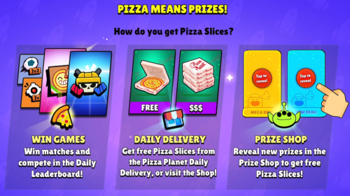 С 2 января и до начала февраля в Brawl Stars вас ждёт множество сюрпризов в честь праздничного события “Планета Пиццы”. В Пиццерии действуют специальные акции, которые выберет для вас волшебная кран-машина. Заходите в игру ежедневно, чтобы получить подарки, а вкусные кусочки пиццы используйте для разблокировки Миппла и других наград.