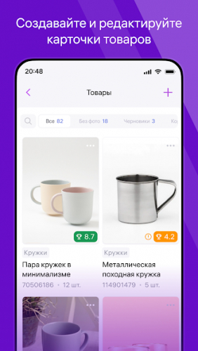 - Редактирование карточек товаров и управление остатками;