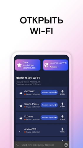 WiFi Passwords Map Instabridge — это универсальный помощник для тех, кто хочет всегда оставаться на связи, экономя на интернете.