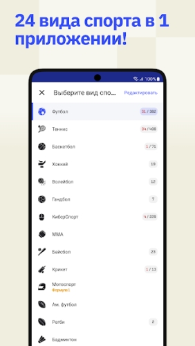 - Широкий выбор видов спорта - от футбола и хоккея до крикета и регби.