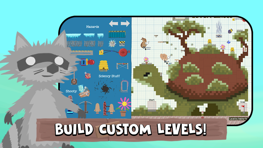 Дополнительно, вы сможете создавать собственные уровни в специальном редакторе и делиться ими с сообществом, а также соревноваться за лучшее время на созданных другими игроками картах. Вам предстоит разблокировать множество забавных персонажей, включая курицу, коня, енота и овцу, и настроить их внешний вид с помощью различных аксессуаров.