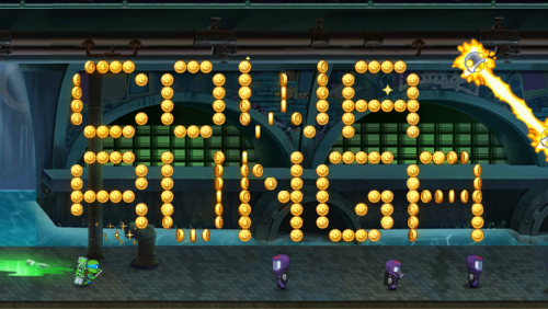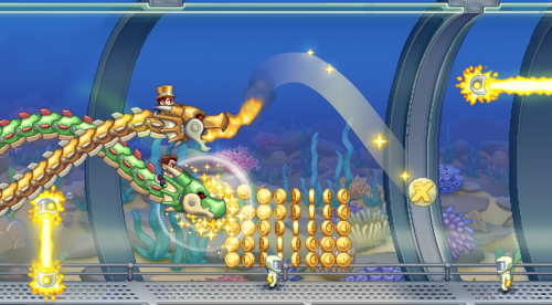 По пути вам предлагается собирать монеты, которые можно потратить на разнообразные улучшения. Экспериментируйте с уникальными джетпаками, от пулемётного до радугового! Также вам предстоит прокатиться на сумасшедших транспортных средствах, таких как гигантский робот, мотоцикл на гравитационной тяге и даже огнедышащий дракон.